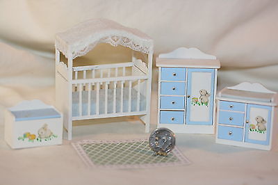The one inch scale nursery set was one of a few pieces that were offered way back in the 80’s, I think. Pat and Mary [Pat Bauder’s original business partner, before she teamed up with Frank Moroz] started in one inch scale in the late 70’s, early 80’s. I’m not sure why Pat eventually moved down to half inch.