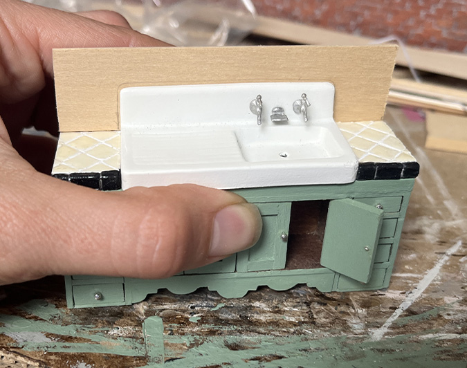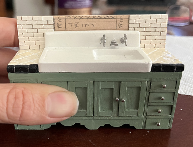 Moving on. As shown here, I started adding lights to the kitchen two and a half years ago (yikes). I had planned to use this light over the sink, made from two Houseworks fixtures that I frankensteined together.
