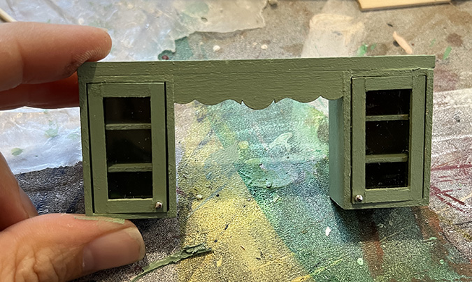 Now it’s time to do something about that big gaping window hole. After a lot of pondering, looking through my stash at different windows, and looking online at pictures of kitchens, I got the idea to make a stained glass window out of laser-cut mullions (sold by D’s Miniatures on eBay).