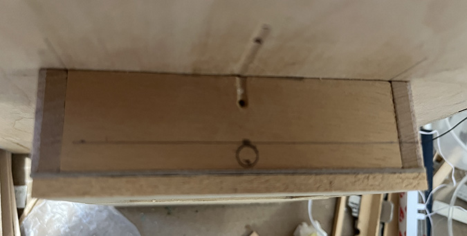 The piece of trim glued across the top of the cabinets doesn’t go all the way back to the wall. This pencil line shows where that trim ends. I have just enough space to drill a hole for the fixture.