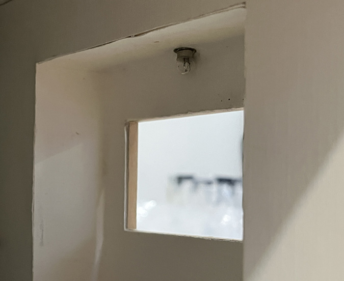 I hadn’t considered that this fixture is a little taller than the thickness of the top of the bump-out, so the back side sticks out. I can add strip wood around the edges of the bump-out to make it a little taller. This will provide a cavity under the roof where I can leave some excess wire, allowing me to pull the fixture out into the kitchen if I need to change the bulb.