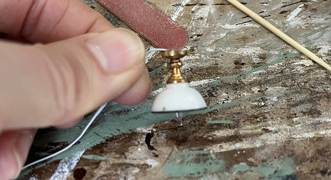 I made the ceiling fixture by combining the base of a table lamp and the shade of a hanging lamp. The ones in the picture below aren’t the ones I used — I had these pieces lying around after using the table lamp shade in the Queen Anne Rowhouse, and after the hanging lamp broke in the Gull Bay Cottage. (Proof, yet again, that nothing should be thrown away, ever… even if it’s broken!)