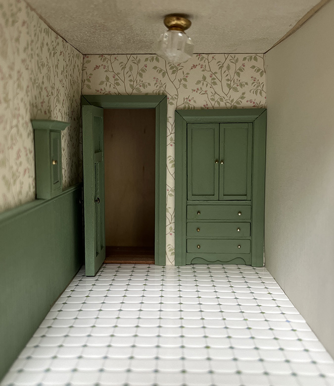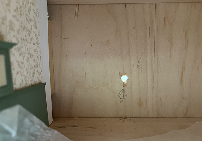 This is a front-opening house with a solid back. I’m adding false walls at the backs of the rooms to give the illusion that there’s a hallway behind them, and hiding wiring and power outlets behind the doors.