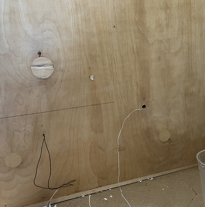 And they come out the back side, where they plug into a power strip. I’m making the holes big enough for the plug to fit through, so I don’t have to remove and reattach the plugs.
