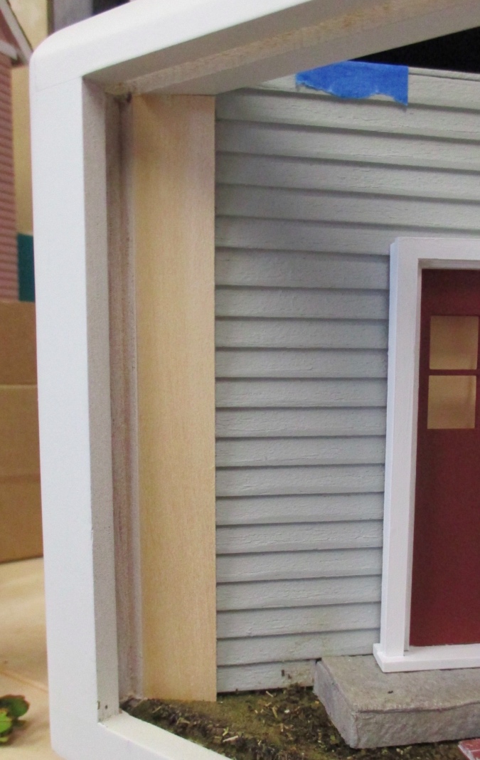 Next I added quarter round to the corners, to cover up the gaps where the siding edges meet.