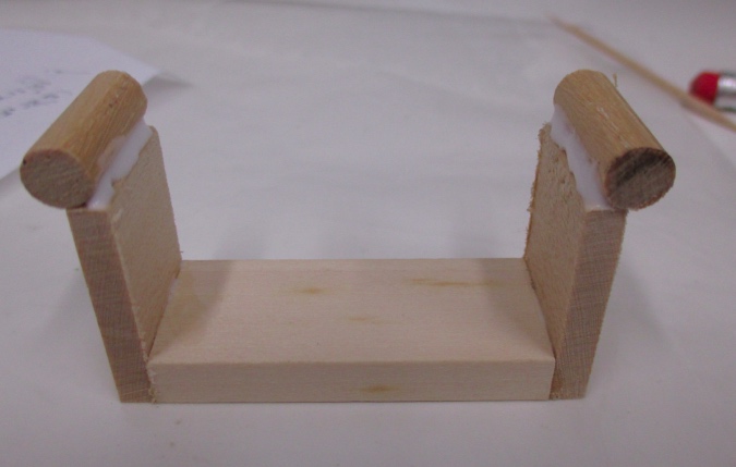 Glue the arms to the base. Glue the armrests to the tops of the arms, with the dowel pieces positioned on the edges of the arms as pictured. Use a lot of glue, then leave it alone to dry!