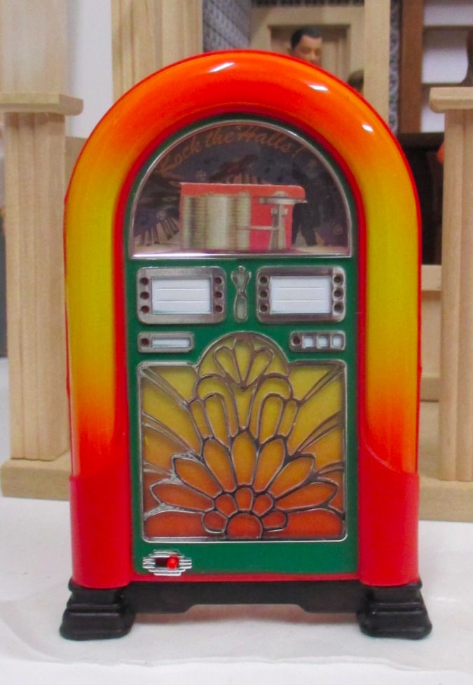 So I turned to Christmas ornaments. I looked at Hallmark ornaments first since those tend to work well in miniature settings (I used a bunch in my breadbox roombox). Hallmark has made several jukeboxes over the years but they’re all very Christmas themed, which won’t work for the bar. I ended up buying “At the Hop,” which was made by Enesco in 1987. There are a bunch of them on eBay – I got mine (plus another random ornament I didn’t actually want) for $3.95 plus shipping.