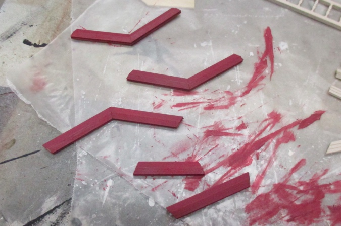 Thinking the angles would be difficult to glue standing up, I attempted to glue them all together so the railing would be one piece, but the assembly was too flimsy. So I ended up with a few segments of partially glued pieces.