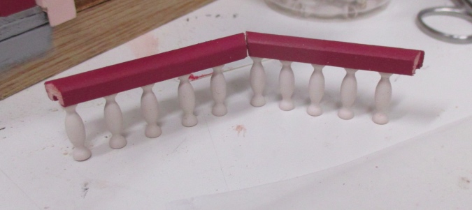 My next idea was to use the Houseworks railing set, which has a top and a bottom piece, but with shorter than normal spindles so the railing wouldn’t block the windows. These are 1 1/2″ spreaders cut in half.