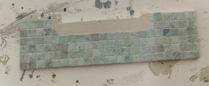 With this in mind, I started tiling. I wanted to glue the sill to bare wood, not to tiles, so I left the area where the sill will go blank. (If you missed the post where I showed the tiling process, it’s here.)