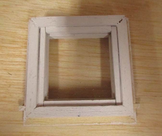 Houseworks windows are slightly deeper than the plywood wall + siding, but don’t come in this size. (The closest is this square window but it was slightly too small.) I previously cut a Houseworks window in half to make a piano window for the dining room, and decided to do the same thing in the kitchen.