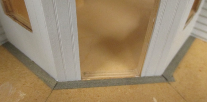 I noticed as I did these first pieces that there was some peach paint showing through at the edges of the porch, due to the masking tape that had been stuck down there. (The peach I originally used seeped under the tape and then the gray didn’t cover it up.) So I paused to paint around the edges before gluing down any flooring.