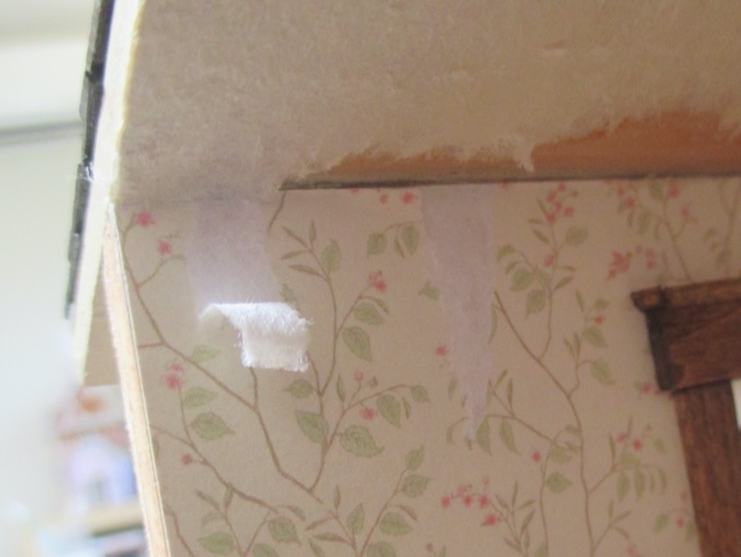 I cut another piece of ceiling paper and glued it in over the shreds of the old one. It’s like it never happened! Except…
