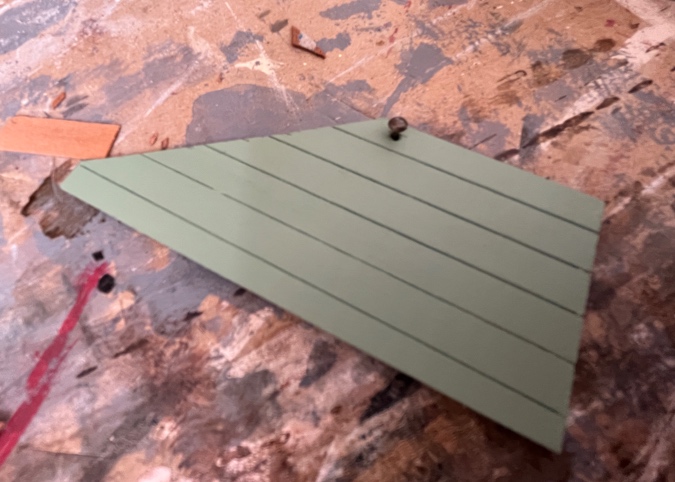 Even after sanding with the mouse sander, the floor doesn’t slide in under the false wall on this side, so I left a little notch in the floorboards. Sloppy, but you won’t see it when the addition is in place.