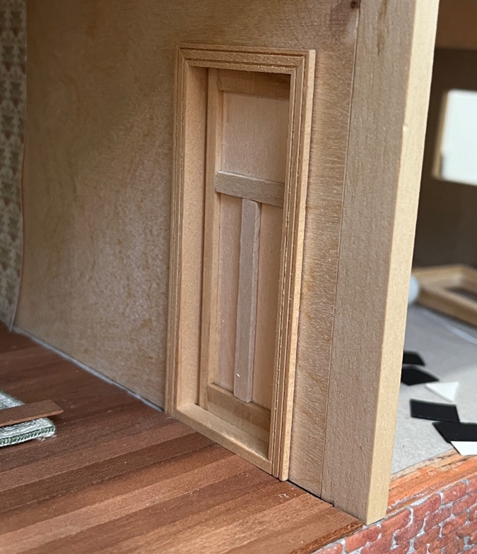 Because this house is deep with a flat, windowless back wall, I decided to make false walls with doors on them, suggesting there’s a hallway behind them. I already have a staircase that goes nowhere, so why not doors that go nowhere?