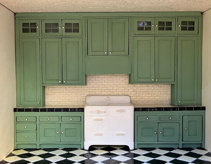 By this point, the paint on the teeny tiny trim pieces had dried, so I glued them in to cover the gaps where the backsplash tiles don’t quite meet the cabinet edges.