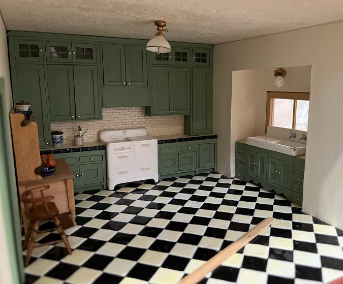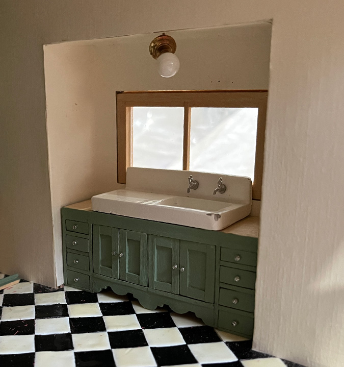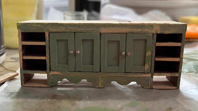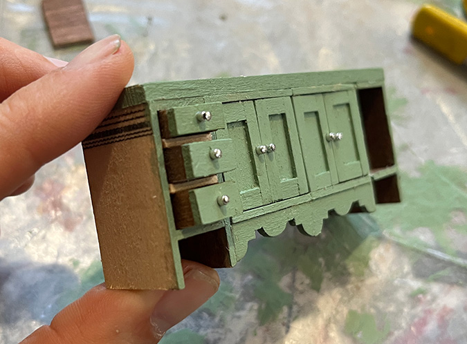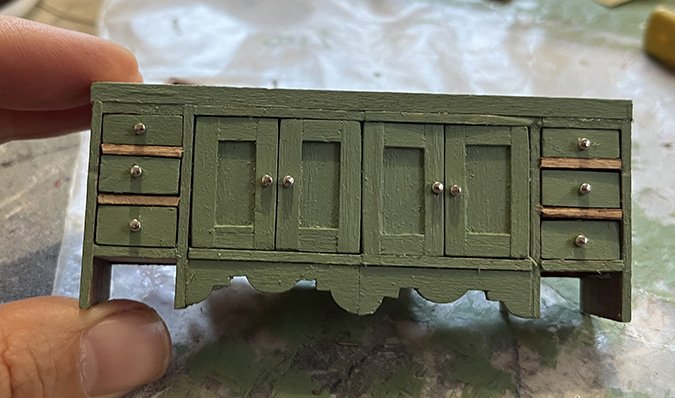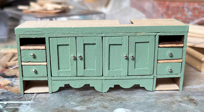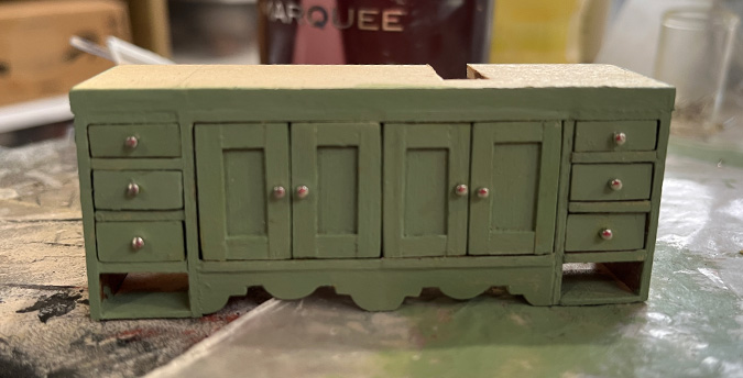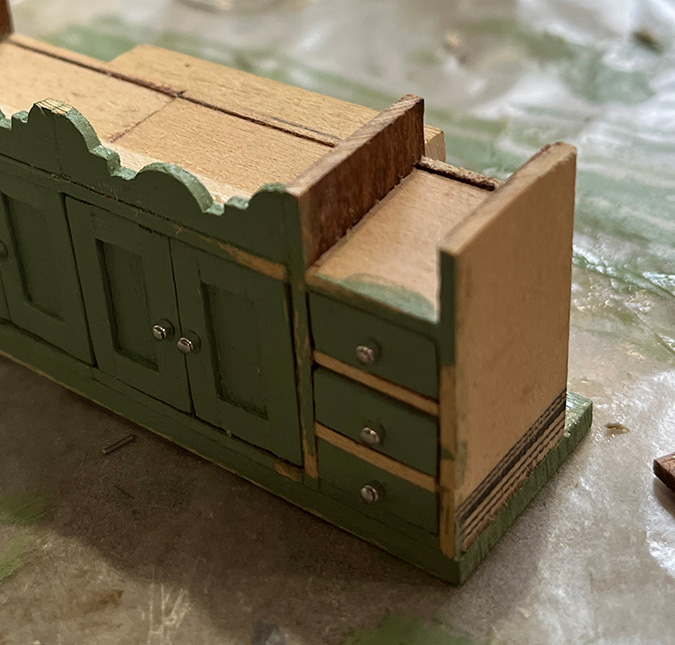 The kitchen sink cabinet I’m making from two Cassidy Creations Oak Washstand kits has decorative trim under the center cabinets (lined up under the sink). At the bottom of the left and right sides, I’d planned to put a plain piece of wood flush with the front of the cabinet.