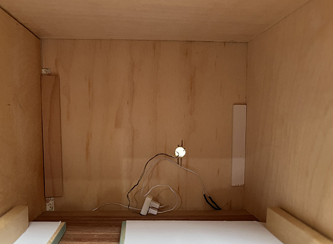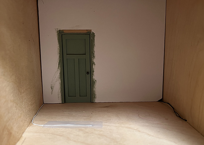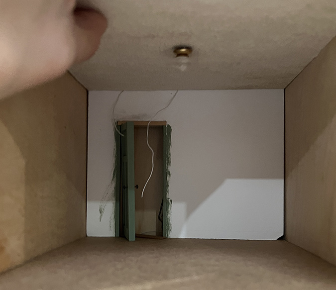 Next I added a plug to the ceiling light, and then glued in the ceiling. (The light itself is not glued to the ceiling yet!) The light plugs into an outlet behind the false wall, accessible through the door.