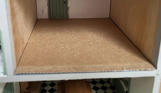 I glued in the mahogany trim piece and a floorboard to cover up the edge of the cardboard.