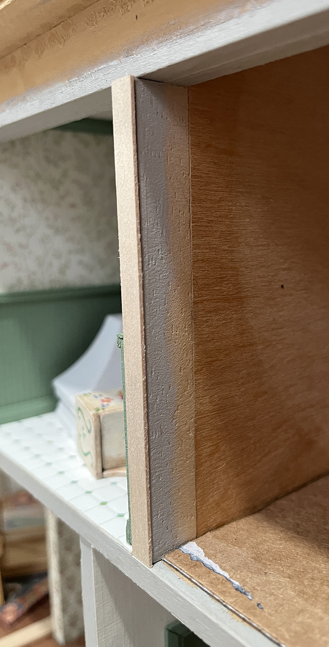 I decided to kill two birds with one stone (sorry, birds!) by adding a piece of thin basswood to the front edge of the wall. This mostly gets rid of the gap at the bottom.