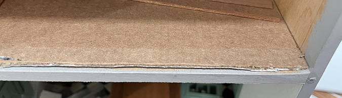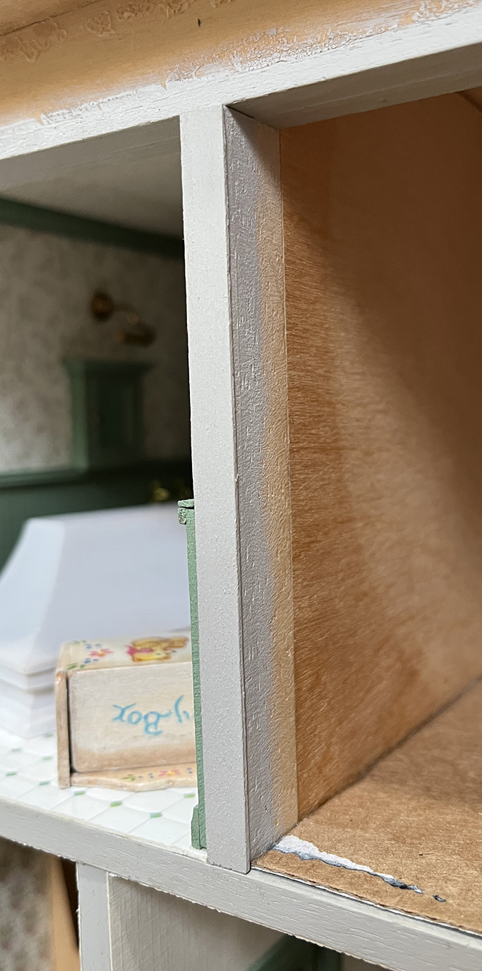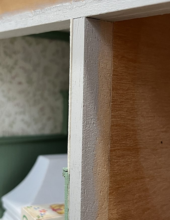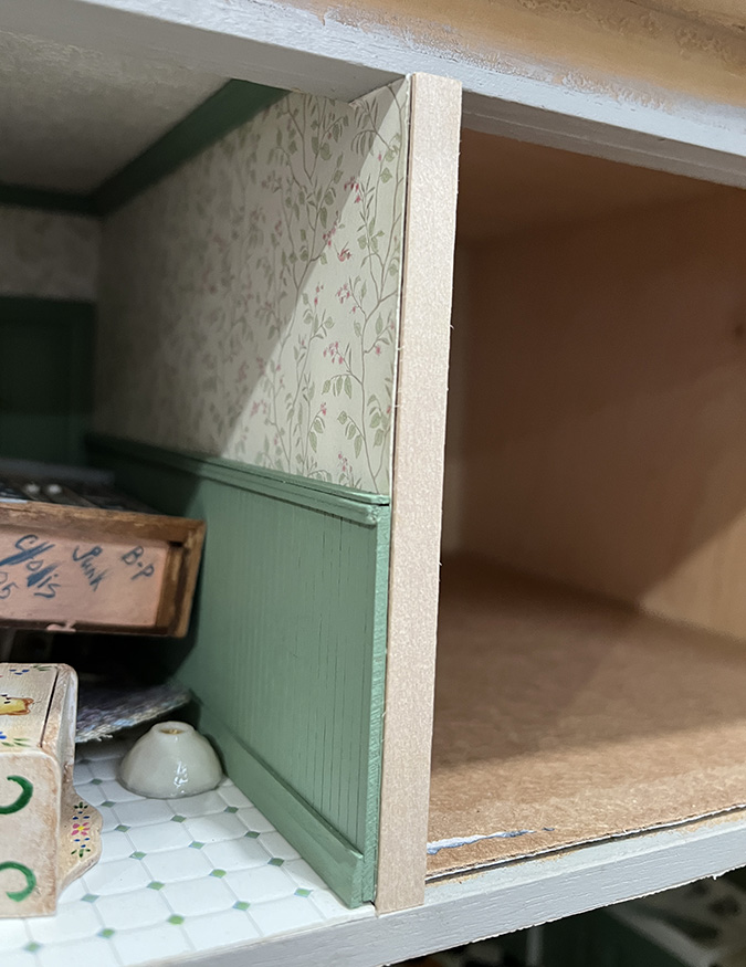 The mahogany is thicker than the basswood piece I’d used as a spacer when I glued in the cardboard, so now the cardboard was slightly too far forward and the corner of the mahogany piece stuck out from the wall. Ugh.