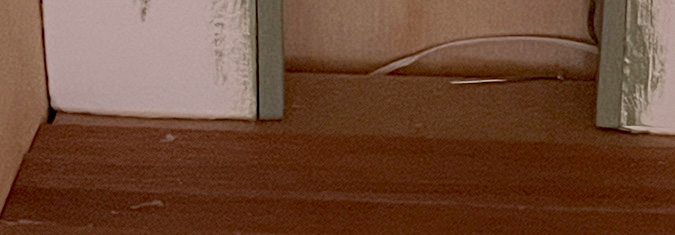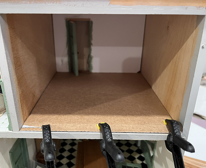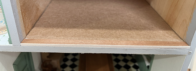 Now the false wall butts up against the floorboards. The last board is still loose for now, because I can’t get the wall in and out with it in place.
