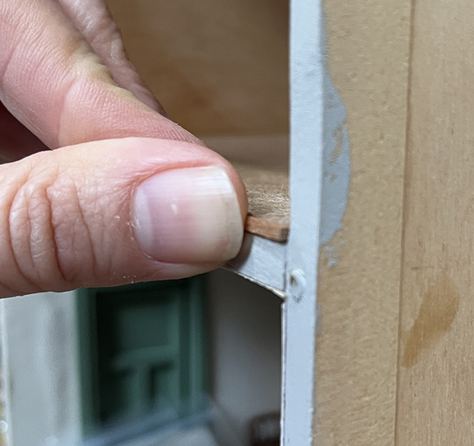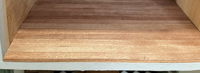 And here’s the piece of basswood I prepared to go in the front of the cardboard, with a floorboard butting up against it.