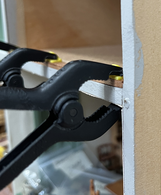The false wall has 1/2″ spacers glued to the back of it. Rather than modifying these, I glued shims to the wall.