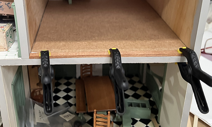 I continued gluing in the floorboards until I got to the point where the false wall will be. The gap between the last floorboard and the wall is skinnier than the width of a floorboard.