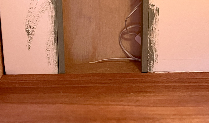 So I already knew I’d have to cut a notch of some sort in the wall to get the wires through. Once I’d glued in the shims, pushing the false wall a little farther into the room, I discovered that the false ceiling no longer fit.