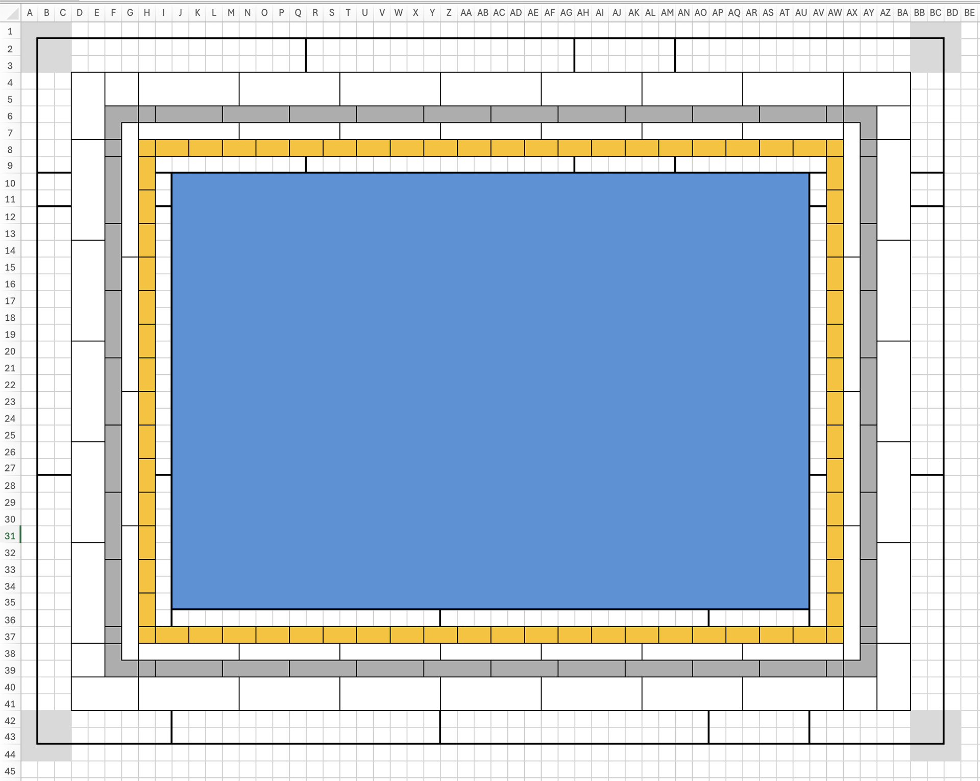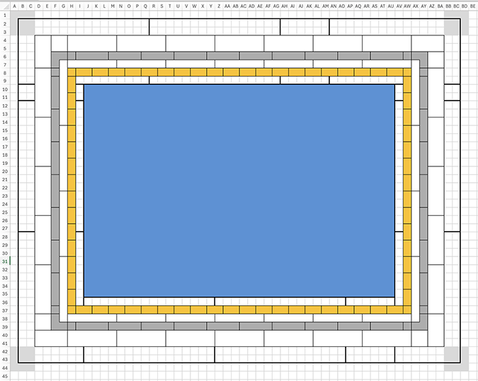 I started by diagramming the frame in Excel. (I actually started by attempting to draw it on graph paper, but that quickly got messy.) Click the picture for a larger version if you want to print it out.