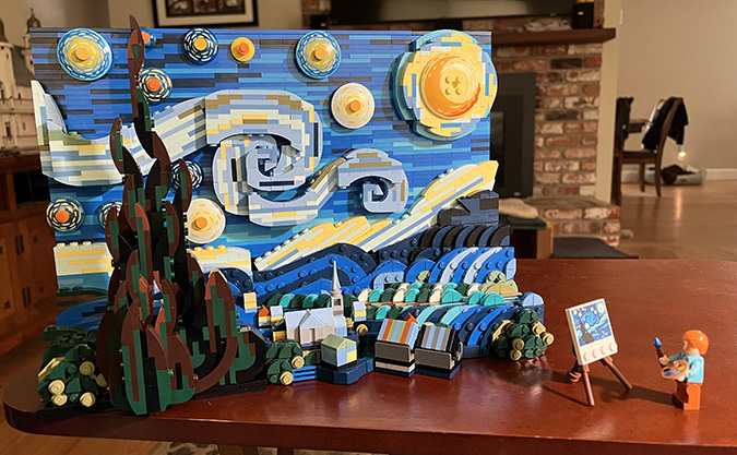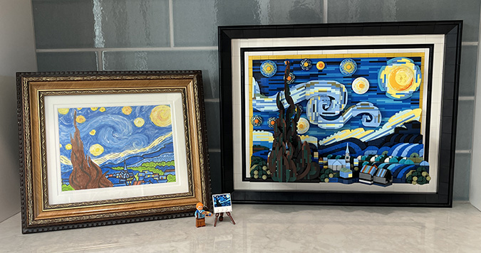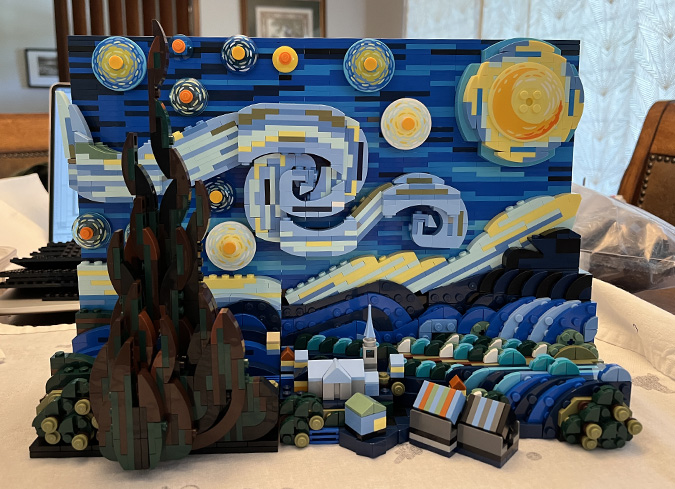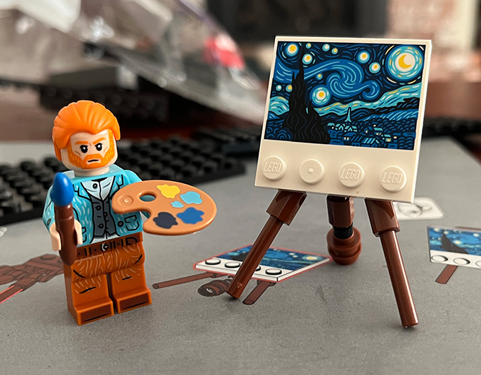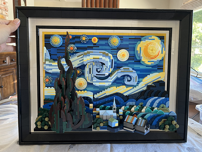 Since I’d seen several comments from people asking for instructions for the modified frame, I figured I might as well write up how I did it. If your Google search for how to upgrade the frame for the LEGO Starry Night set has brought you here, I hope this post is helpful. If you just want the parts list, jump to the bottom.