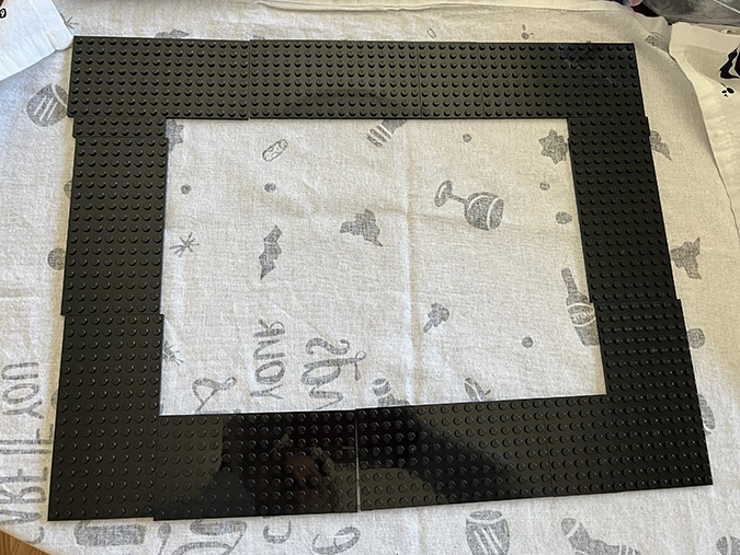 The modified frame starts with nine 8×16 plates, two 6×8 plates, and two 2×8 plates. The 2x8s go on the sides and the 6x8s go on the top and bottom.
