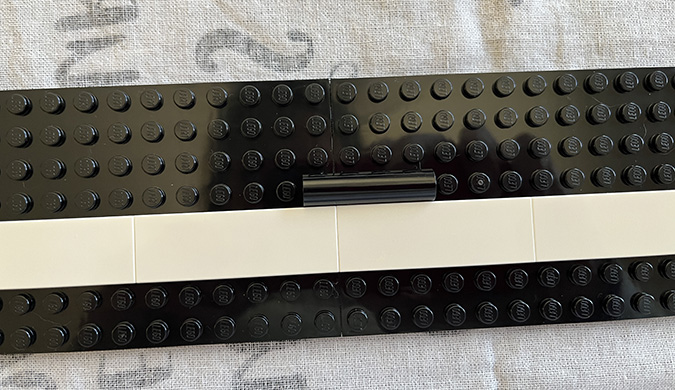 First I laid down the outer white tiles to join the plates together. One 2×4 and one 2×2 are used in each corner. The rest are 2×6.