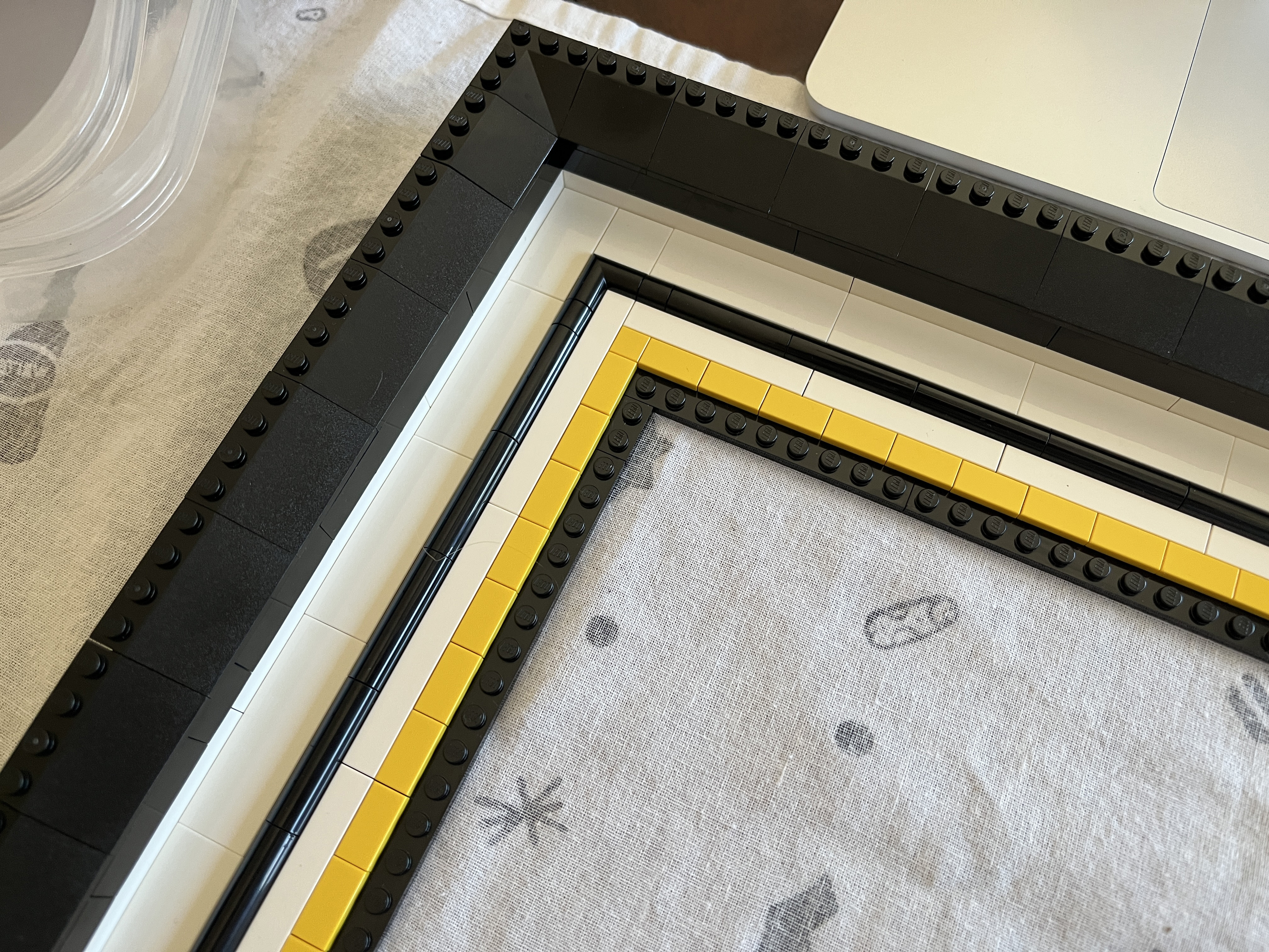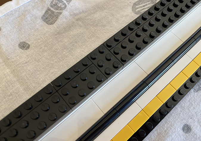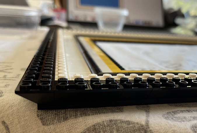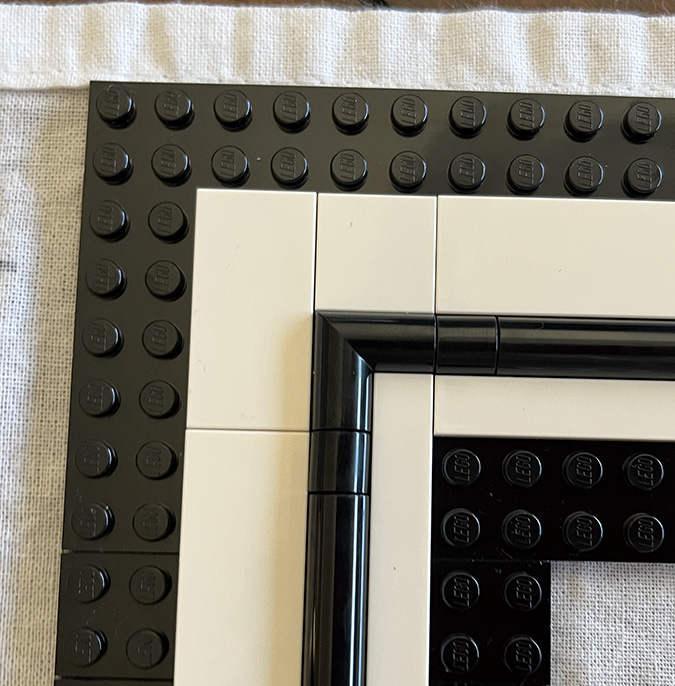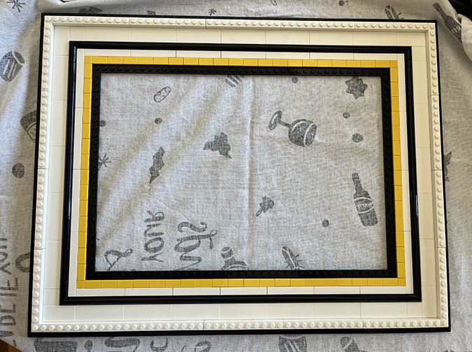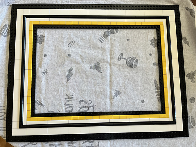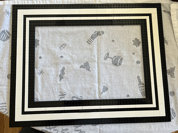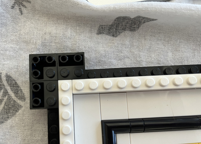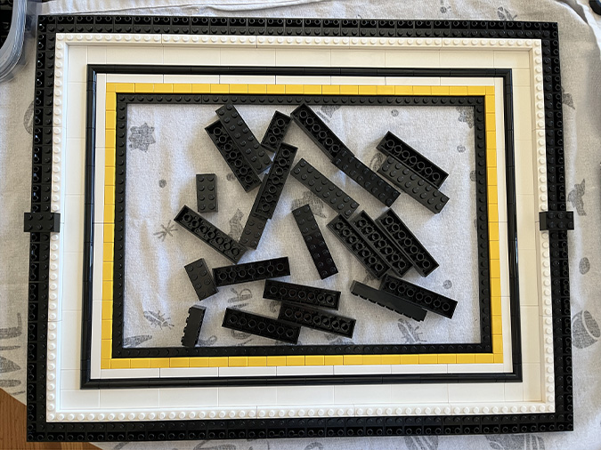 At this point I referred back to the booklet (Step 147) to understand how the outside part of the frame comes together. In the original build, this border would have been black, but in the YouTube video it’s done in white. I had to buy new pieces anyway since the black ones that come in the kit weren’t the right orientation for the larger frame, so I bought white ones. These are all 1×10.