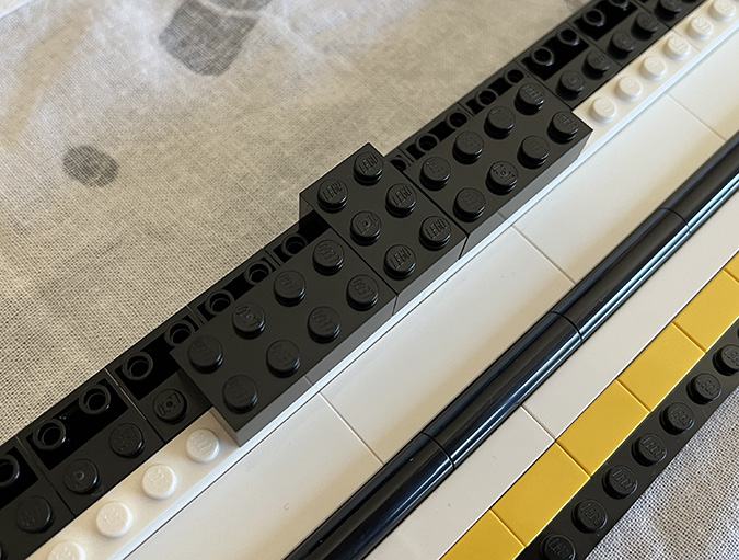 At this point I went into the #6 bags and combined the curved black pieces from the set with the extras I’d bought. I then added the black outline between the two white outlines. 1x1s go next to the corner pieces and the rest are 1x4s.
