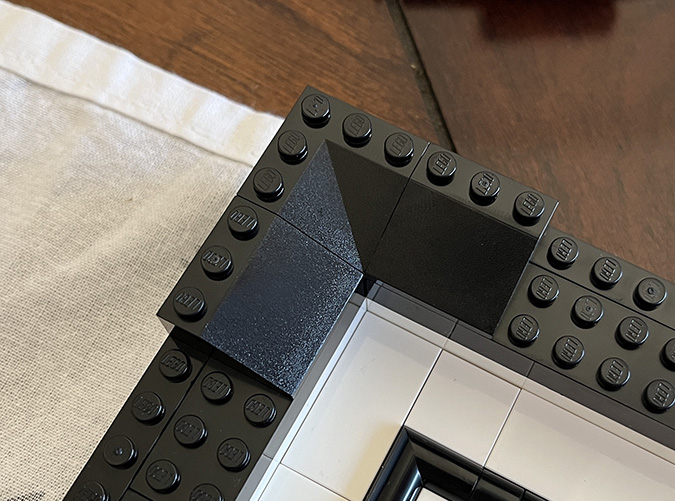 Next we add 3×3 corner bricks to the four corners of the frame.