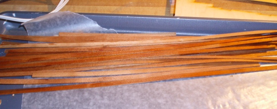 For the staggering price of $2, Peg sold me a package of teak lumber as well as some loose pieces that I initially thought were the same stuff and had just fallen out of the package. (More on this below.) I started with the loose pieces. They were already smooth and a nice reddish color, so I skipped sanding/staining and instead coated them with matte varnish to add a bit of a sheen.
