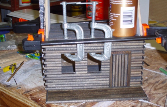 I did all the “slivers” to the sides of the door and windows, then added the long log across the top and clamped it in while it glued to make sure it was straight. It sits slightly above the tops of the windows. I’m not sure if I’ll do anything about that (again, I want to see how it looks once I’ve weathered the logs with gray stain).