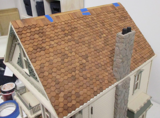 When I started the shingles, I was using The Ultimate white glue. I didn’t have any of that when I re-started, so I used Aleene’s fast grab tacky glue. Unfortunately it didn’t grab as fast as I’d hoped — I could only get through about a row and a half before the shingles started buckling so much I needed to tape them down and set the house aside for a day while the glue dried.