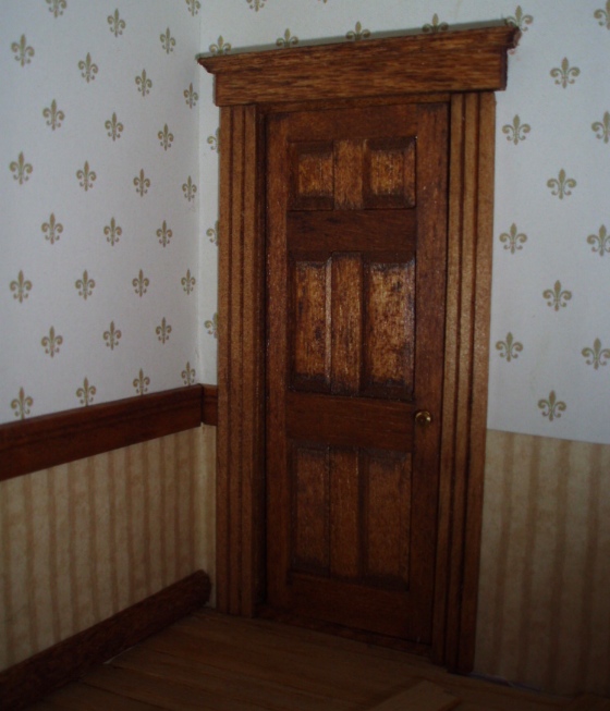 And here’s the open doorway in the living room, that leads into the kitchen. Originally this had an arched top but I filled it in with foamcore. This one’s a bit too wide, I should have cut it down but I didn’t realize until after I’d already glued the cove molding onto the top. So I left it. Hopefully I’m my own worst critic on this and no one else will notice. (Or if they do, they’ll be too polite to mention it.)