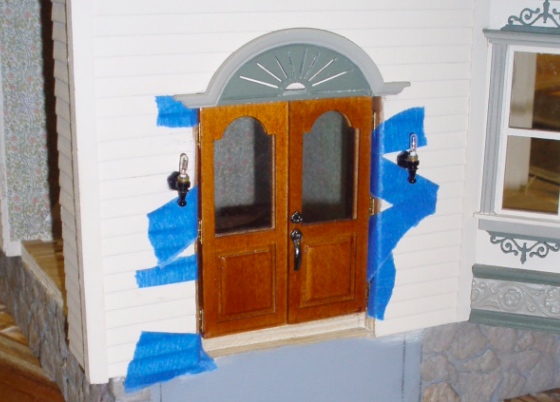 One of the first components I splurged on for this house was a Bespaq Newport double door for a whopping $34. Not entirely sure what my color scheme would be, I got the white one, thinking I could paint it. But then I realized the door wouldn’t easily come apart — unlike a Houseworks door, the pin hinges are hidden (no way to pull them out and remove the doors from the frame), plus the windows (which are real glass) don’t slide out. The idea of painting it gave me a conniption. So I splurged again and got the wood version… which I also wasn’t entirely happy with. It just seemed too dark and put the house off balance.