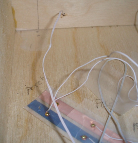 I used the Xacto knife to remove the door trim, and sanded and painted over the area where the old light had been glued. I also painted some of the wire the same color as the house, so it would blend in, but I’m not sure that was really necessary. Then I glued on the new fixture with super glue.