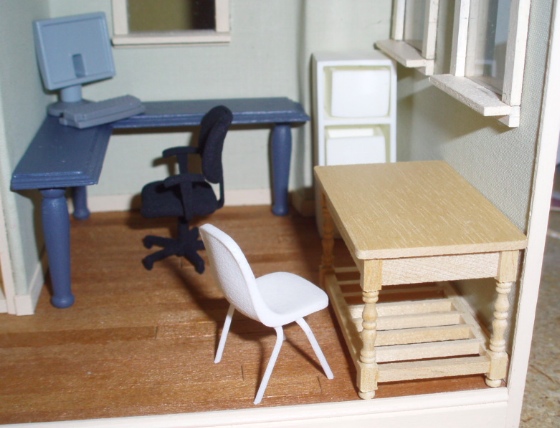 When I built the Rosedale, I planned to make the smaller room on the first floor into a laundry room, but when I pulled out the house at the beginning of this year to do the finishing touches, I decided to turn it into a home office instead. I’d originally intended to have two bathrooms upstairs but realized the one on the third floor (adjoining the master bedroom) was too small and strangely shaped to work out, so I’m going to put the laundry in there instead.