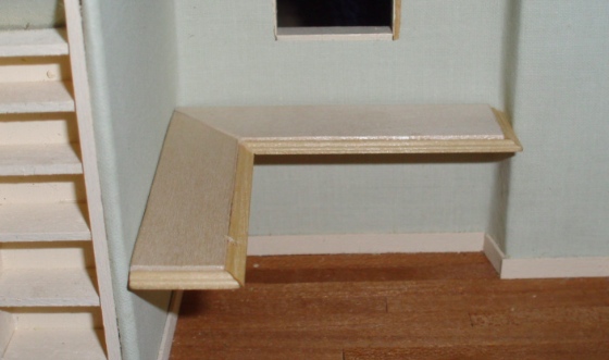 For legs, I cut down 1:12 porch spindles. I didn’t have a chair yet (I ordered that later…), so I was guessing on the height. I checked an IKEA catalog for desk height dimensions and used a segment of the spindles that was about the right height.