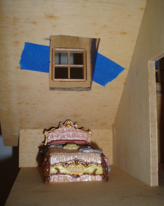 While that dried, I tackled adding dormers to the back roof. Because the house is enclosed, it’s dark inside and hard to see the furniture. By adding dormers, there will be another view into each of the upstairs rooms as well as additional holes for light to come through.