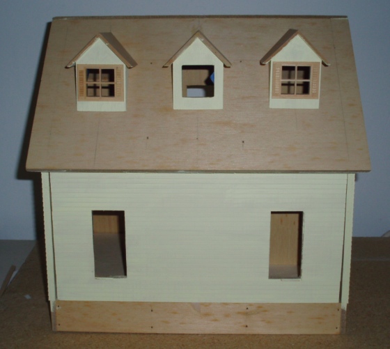 Today I did a second coat of paint on the front of the house and a first coat on the back and the dormers. Two of the dormers are old (eBay purchases) and one is newer.