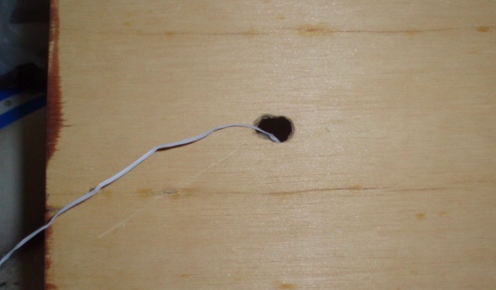 I cut a big enough hole in the cardboard for the plug to fit through. This is covered up by ceiling paper on the good side of the ceiling. I wrapped ceiling paper around the two edges that show, so the cardboard wouldn’t be visible.