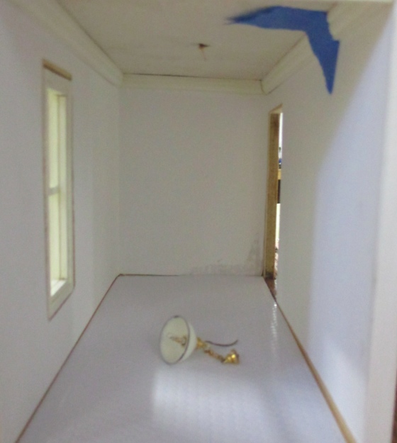 It gets worse. This is a long, narrow room, and while I had my hands in there trying to figure out how to cover up the stain I knocked into the kitchen light and broke it. In a matter of minutes my beautiful, almost finished house had turned into a disaster zone.