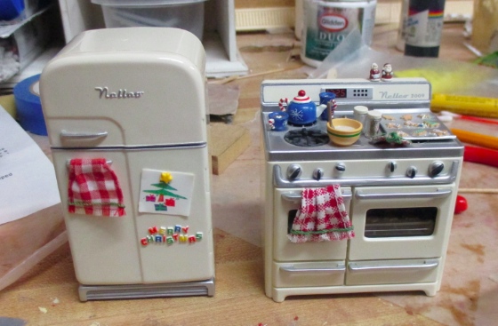 For years, I’ve been holding on to these Hallmark ornaments without anywhere to put them. They’re about 1:12 scale but look way too small when you put them with 1:12 cabinets (especially the fridge). And I love the detail, but didn’t necessarily want Christmas stuff in one of my dollhouses year round. Then there’s the fact that I mostly do half scale these days… I used to have them in my purple Arthur and they fit well there, but I unloaded that house on Craigslist last year.